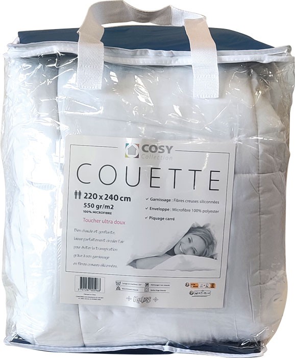 Couette Hiver pour lit 2 personnes fabriquée dans une microfibre de qualité supérieure au tissage très serré (90 gr/m2).Confortable et résistante, son toucher est ultra doux. Bien chaude : 550 gr/m2 sa fibre creuse siliconnée vous garantie une répartition optimale de la chaleur et est idéale pour une chambre chauffée entre 18 et 20 degrés. Finie avec un piquage carré pour une répartition homogène de la fibre. Par sa nature cette couette est totalement hygiénique et hypoallergénique : enveloppe et garnissage 100% polyester. Elle peut être lavée à 30°, son tissu est infroissable. Fabriquée dans une usine conforme au Standard 100 OEKO-TEX, un système de certification indépendant qui garantie que les textiles ne contiennent pas de produits nocifs pour la santé.