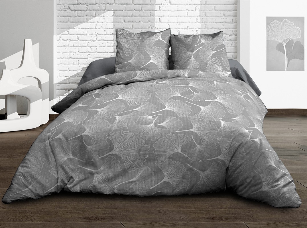 Housse de couette Coton 57 Fils - Biloba gris - 220x240 cm + 2 taies assorties