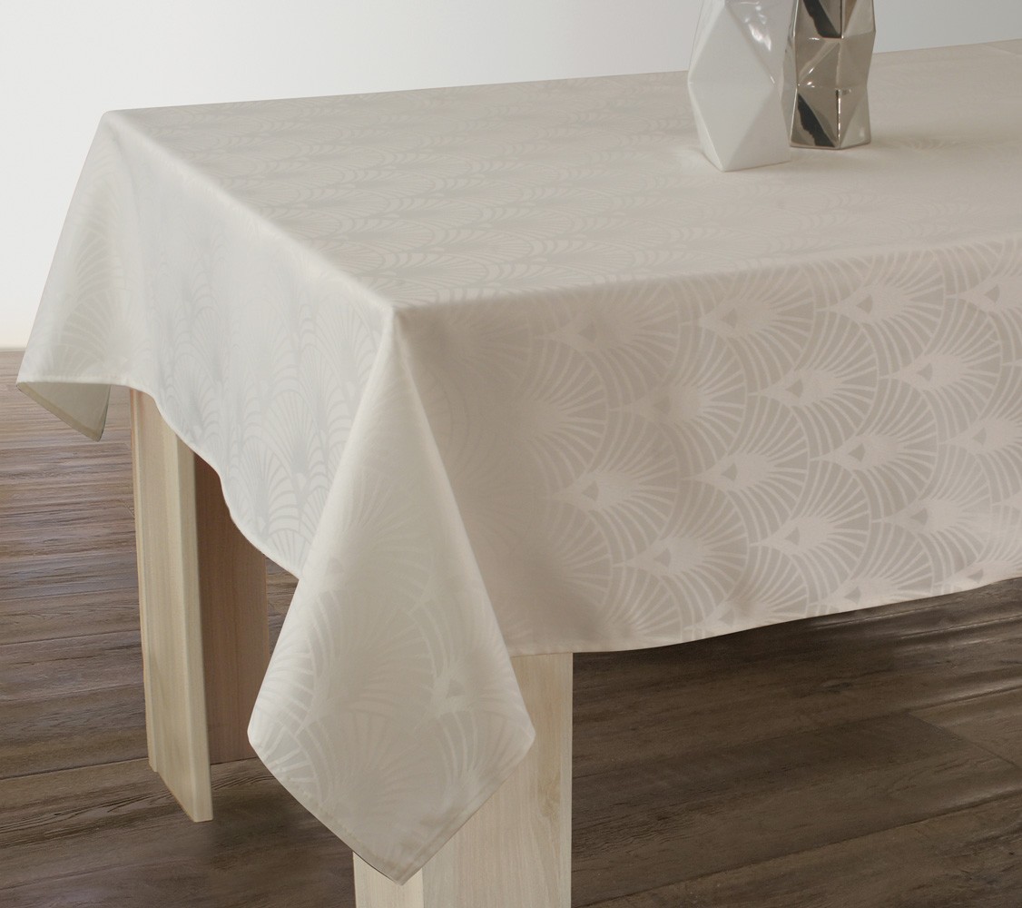 Nappe avec un motif damassé de qualité lourde et traitée déperlant. Garantie grand teint, anti-taches et facile d'entretien : lavage en machine à 40° Repassage superflu et séchage ultra rapide. Composition 100% Polyester