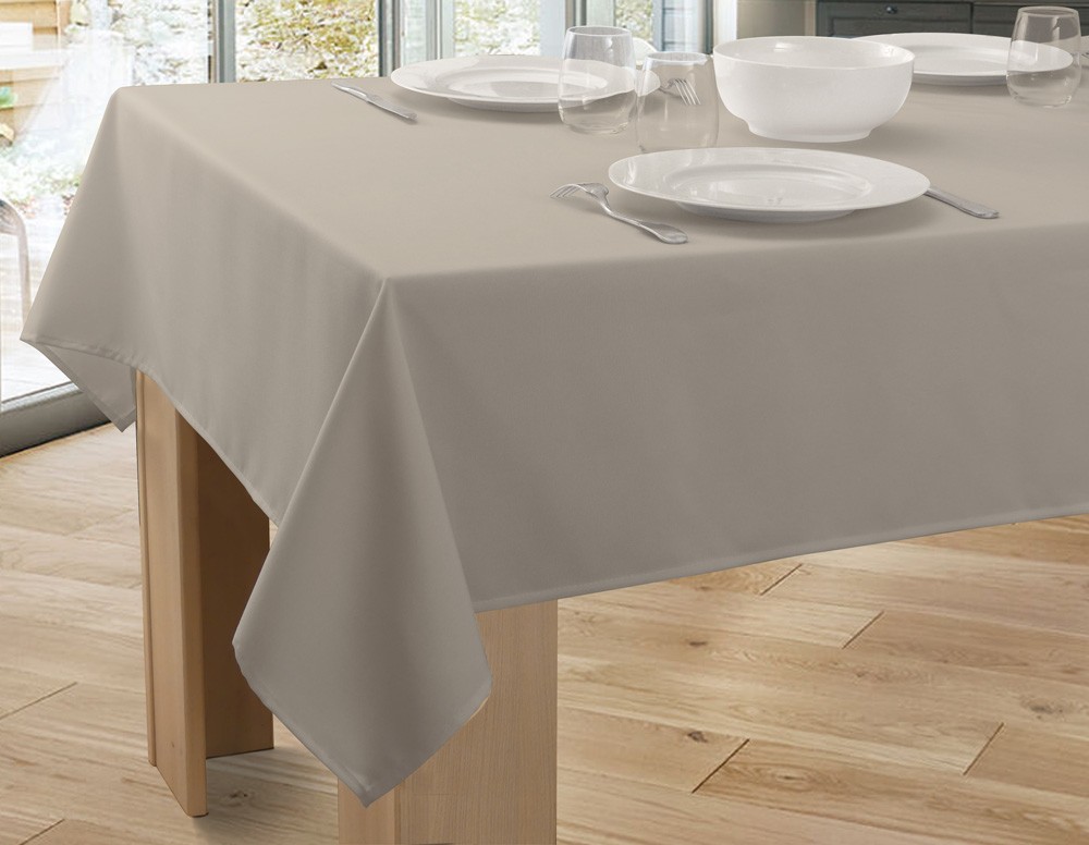 Nappe unie anti-taches, qualité lourde et traitée déperlant. Garantie grand teint, facile d'entretien : lavage en machine à 40° Repassage superflu et séchage ultra rapide. Composition 100% Polyester